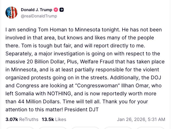 Good morning everyone. It’s the start of another busy week and we’ve got a lot to unpack. President Trump is frustrated with how the Department of Homeland Security is managing federal operations in Minnesota after the fatal shooting of Alex Pretti by federal immigration agents, and he’s now sending his border czar Tom Homan to Minnesota to oversee the situation amid growing criticism and nationwide protests.