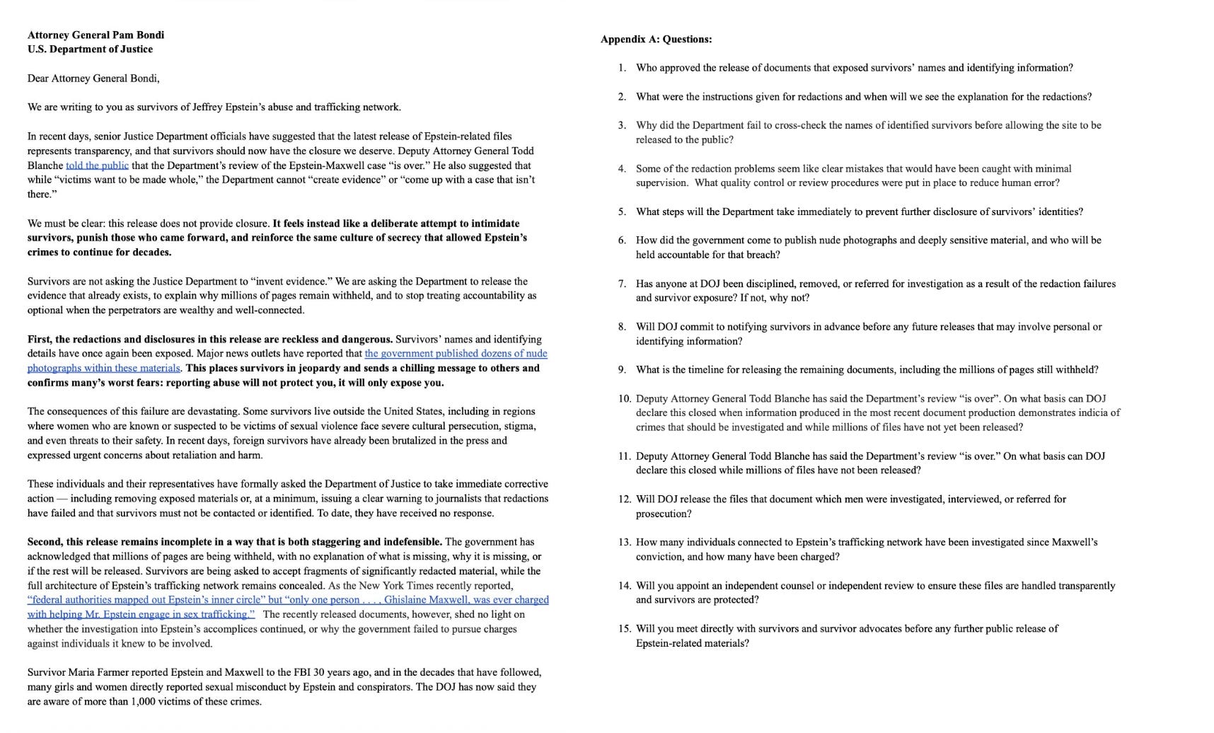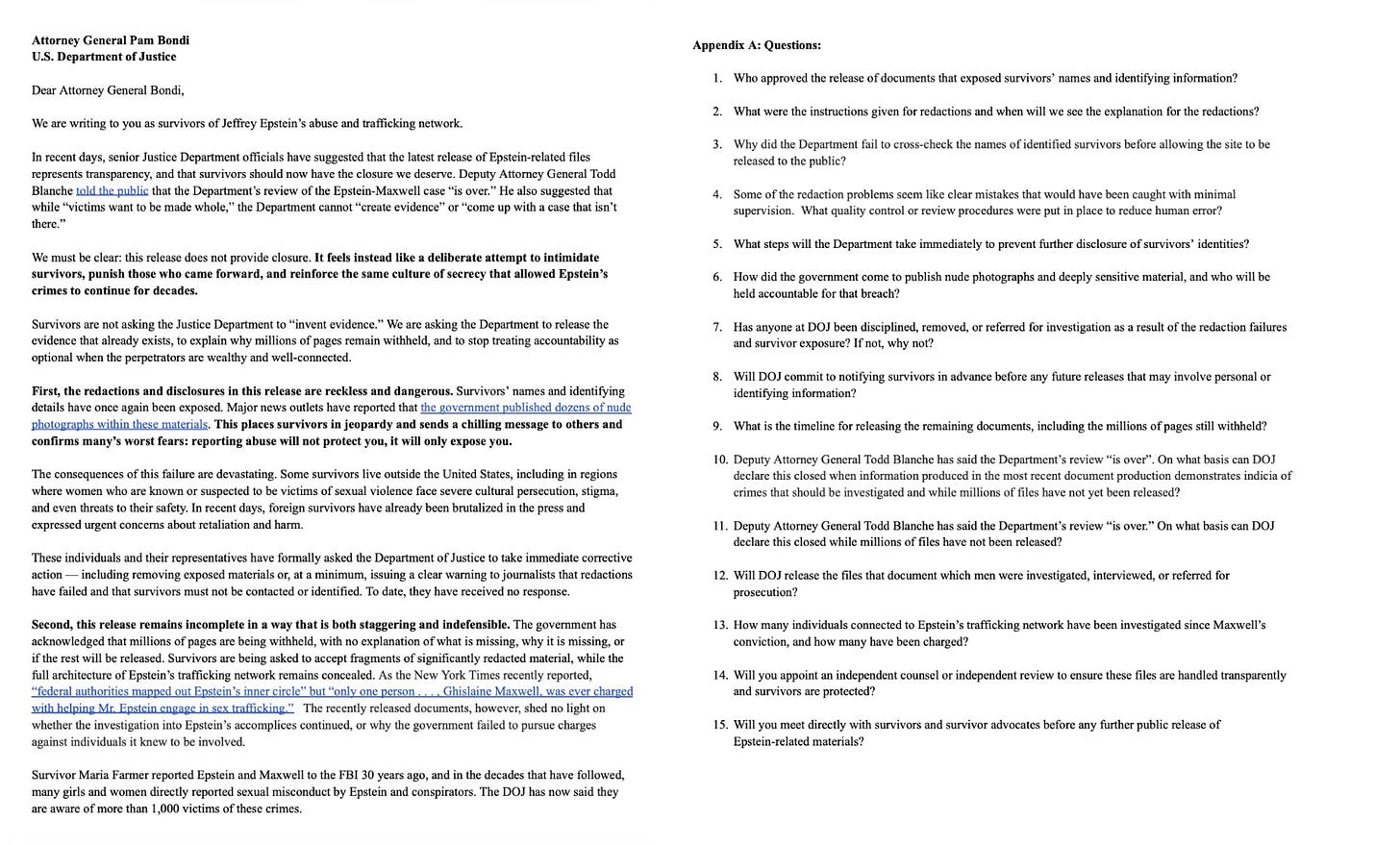 Epstein survivors released the following letter ahead of Pam Bondi's testimony tomorrow blasting the DOJ's failures and demanding answers to 15 key questions during her hearing. "The Department’s actions to-date mirror the very dynamics Epstein relied upon: powerful actors protected by secrecy, while victims are exposed, scrutinized, and made to bear the consequences."