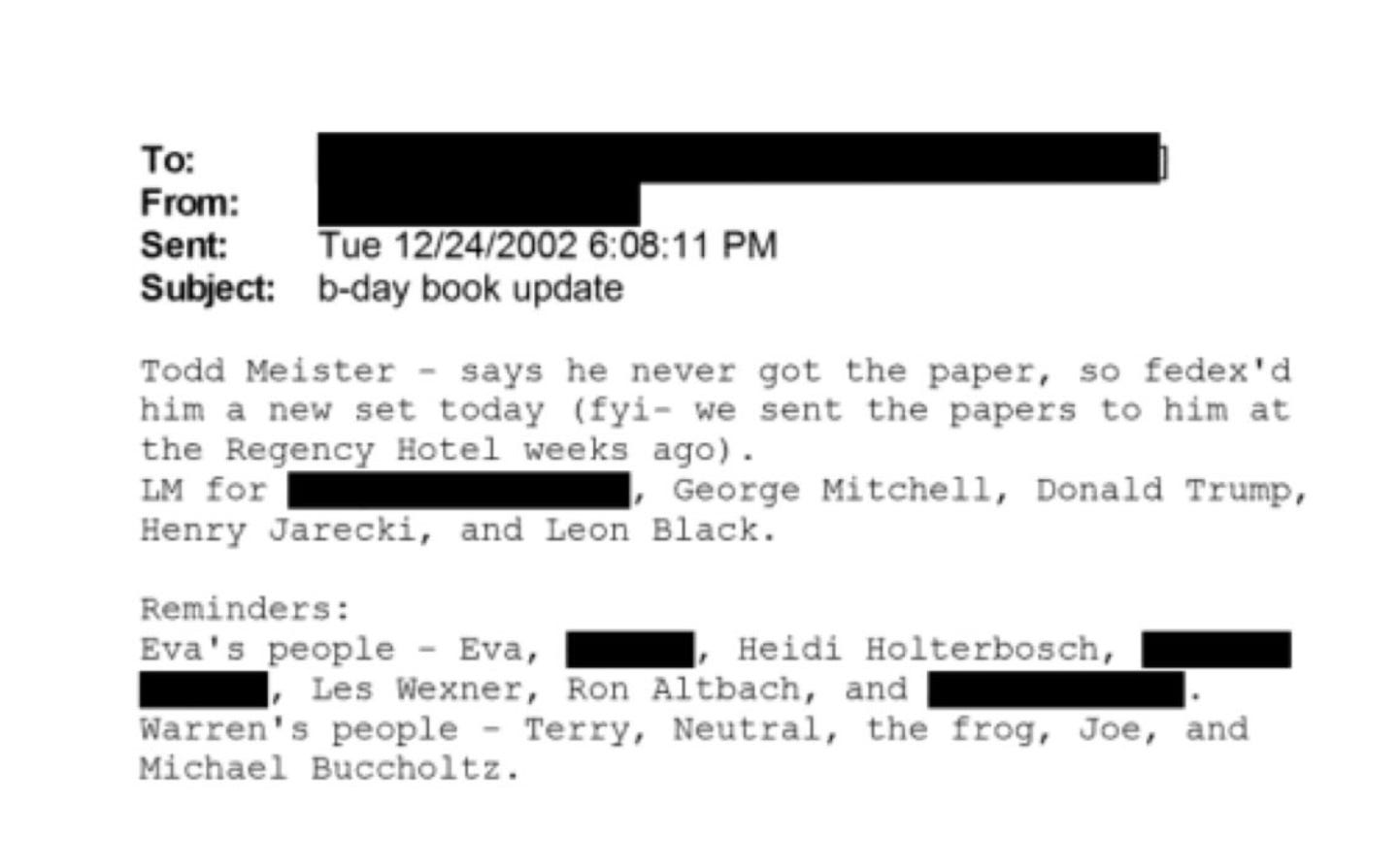 New Epstein file discusses the 2003 birthday book with the alleged birthday book note sent by President Trump (a note he denies writing). This email, which is redacted, explicitly notes requests for the birthday book from Trump.