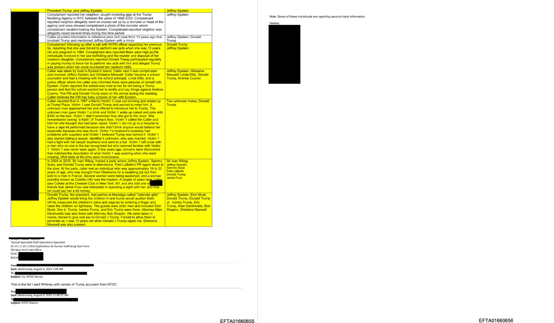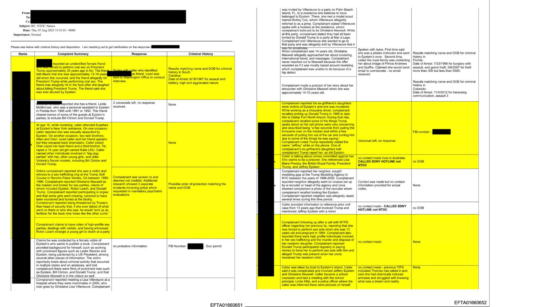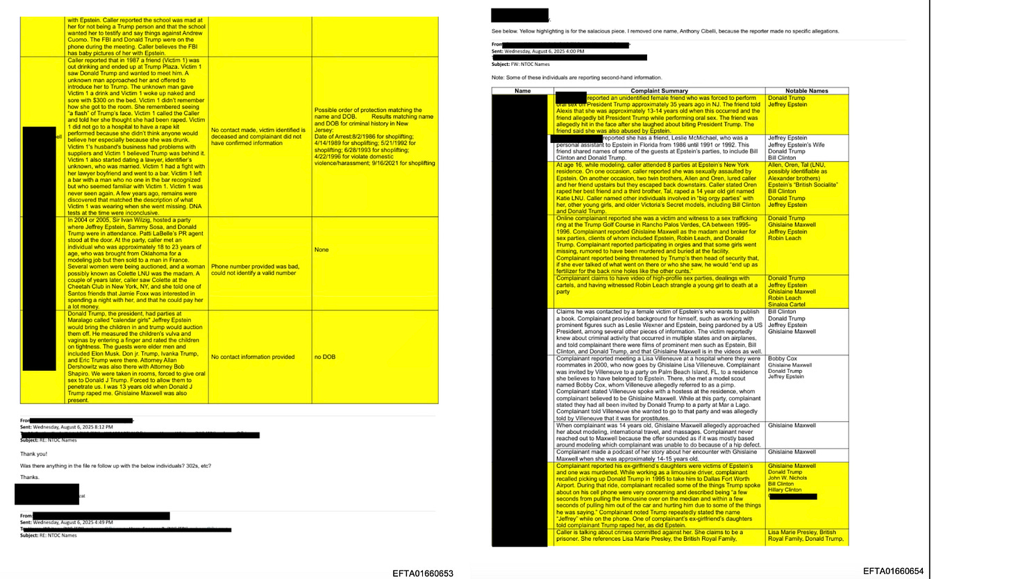 One of the files released today outlines a list of complaints and accusations made by individuals against President Donald Trump. This file was posted this morning, deleted by the Department of Justice for several hours, and is now back online. This file contains a list of tips the FBI received. What’s unclear is if the FBI followed up on any of these tips. The allegations are horrific: