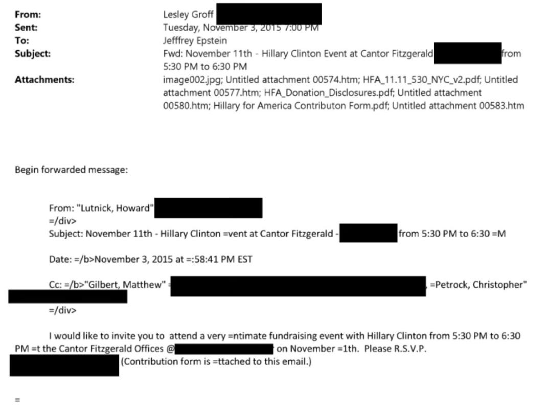 Trump’s Commerce Secretary Howard Lutnick—formerly CEO of Cantor Fitzgerald and a longtime neighbor of Jeffrey Epstein on Manhattan’s Upper East Side—said that a 2005 visit to Epstein’s townhouse, where Epstein showed him and his wife a “massage room,” so disgusted them that they vowed never to be alone with him again, yet a newly released 2015 email shows Lutnick inviting Epstein (via Epstein’s longtime assistant) to a Democratic fundraiser Lutnick hosted for Hillary Clinton; it is unclear whether Epstein attended, and the U.S. Department of Commerce did not immediately comment.
