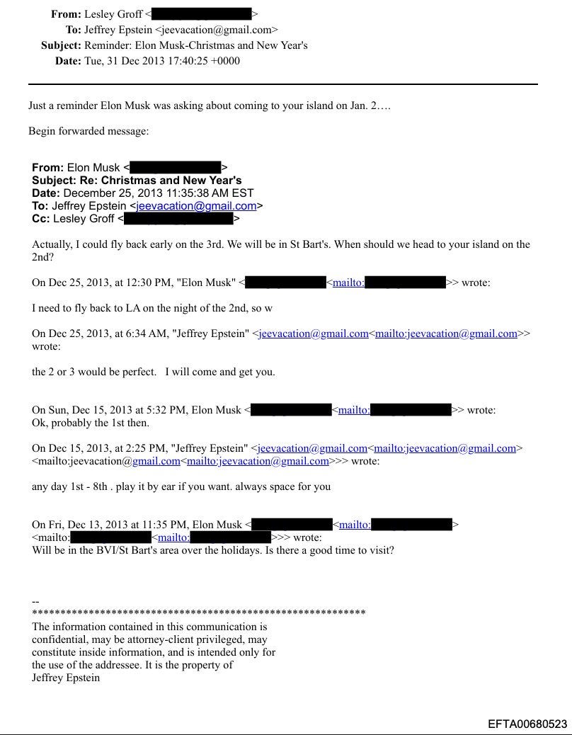 Jeffrey Epstein and Elon Musk discussing when it would be a good time for Elon Musk to visit Epstein’s island: