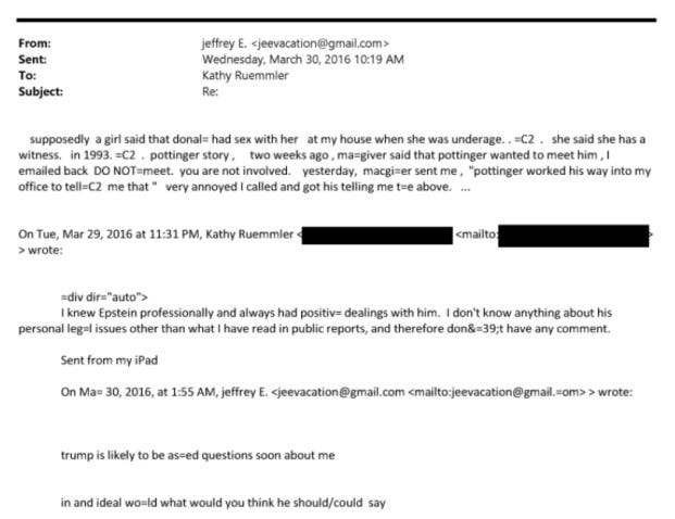 In a March 2016 exchange, Jeffrey Epstein sought legal advice from Kathy Ruemmler about an allegation by a girl who claimed she had sex with Donald Trump while underage; the context notes that Epstein and Ruemmler reportedly used the nickname “MacGyver” for Trump—suggesting he could escape legal trouble—and the timing is could be interpreted to potentially referring to the Katie Johnson lawsuit filed in April 2016, though the allegations have not yet been adjudicated.