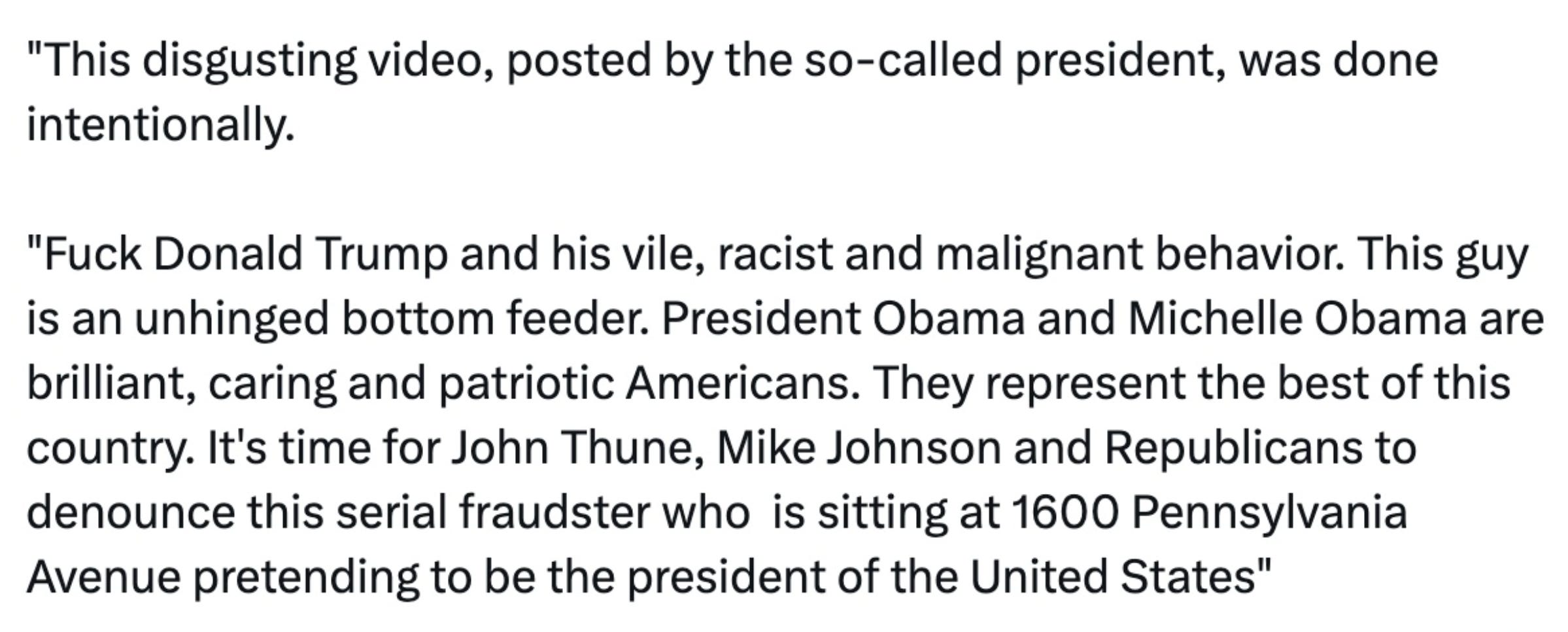 The White House deleted Donald Trump’s Truth Social repost of a racist video depicting Barack Obama and Michelle Obama as apes after bipartisan backlash, saying a staffer “erroneously” shared it, despite earlier public defenses from press secretary Karoline Leavitt before GOP lawmakers urged its removal.