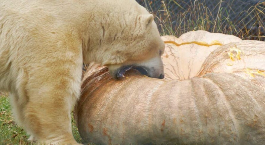 A polar bear named Henry at the Cochrane Polar Bear Habitat in Ontario delighted staff and viewers after cautiously investigating and then joyfully devouring a donated 1,400-pound pumpkin, a surprise gift discovered by chance on a highway and delivered to the sanctuary, where the enormous treat left him happily stuffed and snoozing.