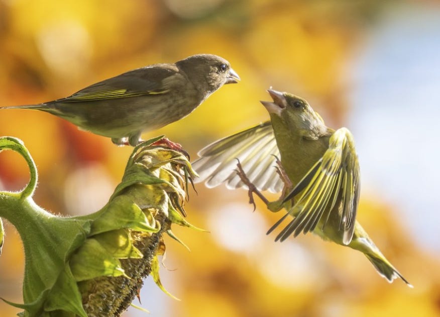 A photographer in Shropshire, England captured vivid autumn photos of great tits and greenfinches plucking sunflower seeds straight from fading sunflowers outside his kitchen window, creating a striking, natural scene filled with rich seasonal color and lively bird activity.