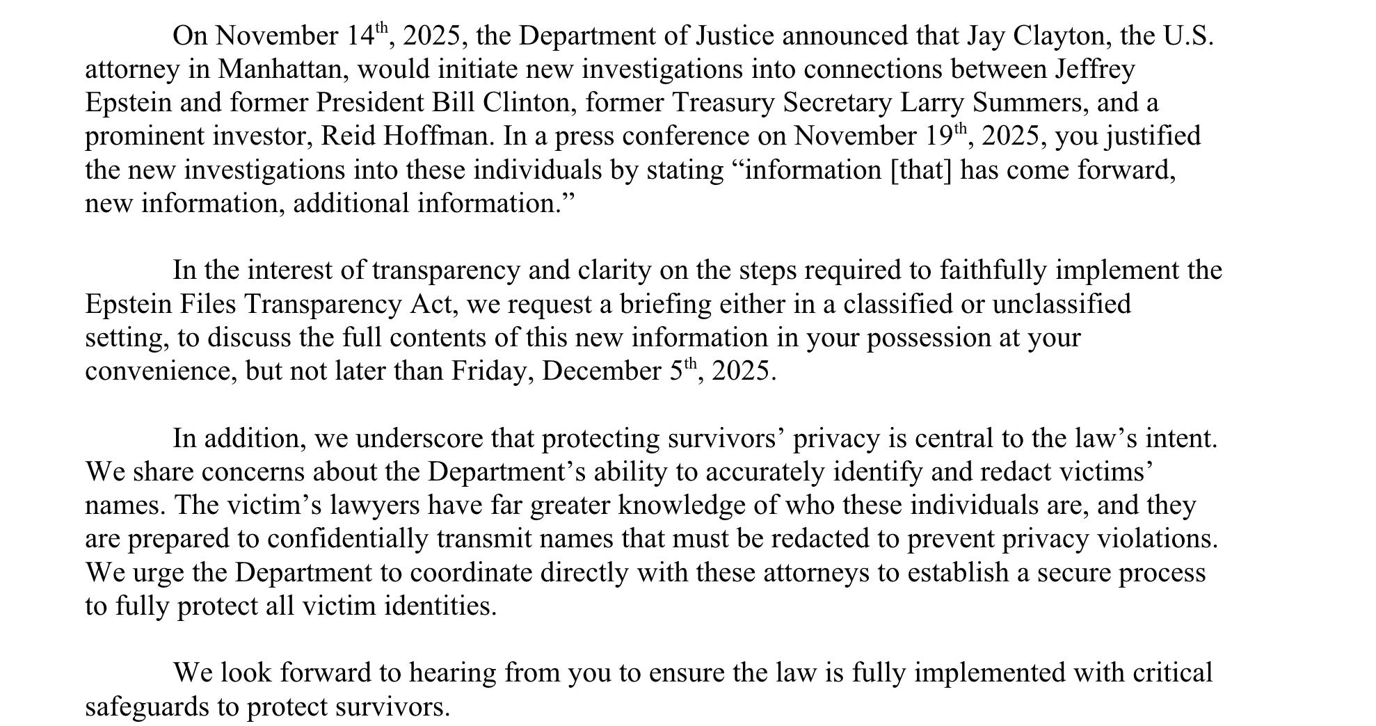 In a letter to Attorney General Pam Bondi, lawmakers including Reps. Ro Khanna (D-Calif.) and Thomas Massie (R-Ky.), and Sens. Lisa Murkowski (R-Alaska), Ben Ray Luján (D-N.M.), and Jeff Merkley (D-Ore.), pressed for clarity on what evidence the DOJ is holding and whether any procedural barriers threaten the mandated release schedule.