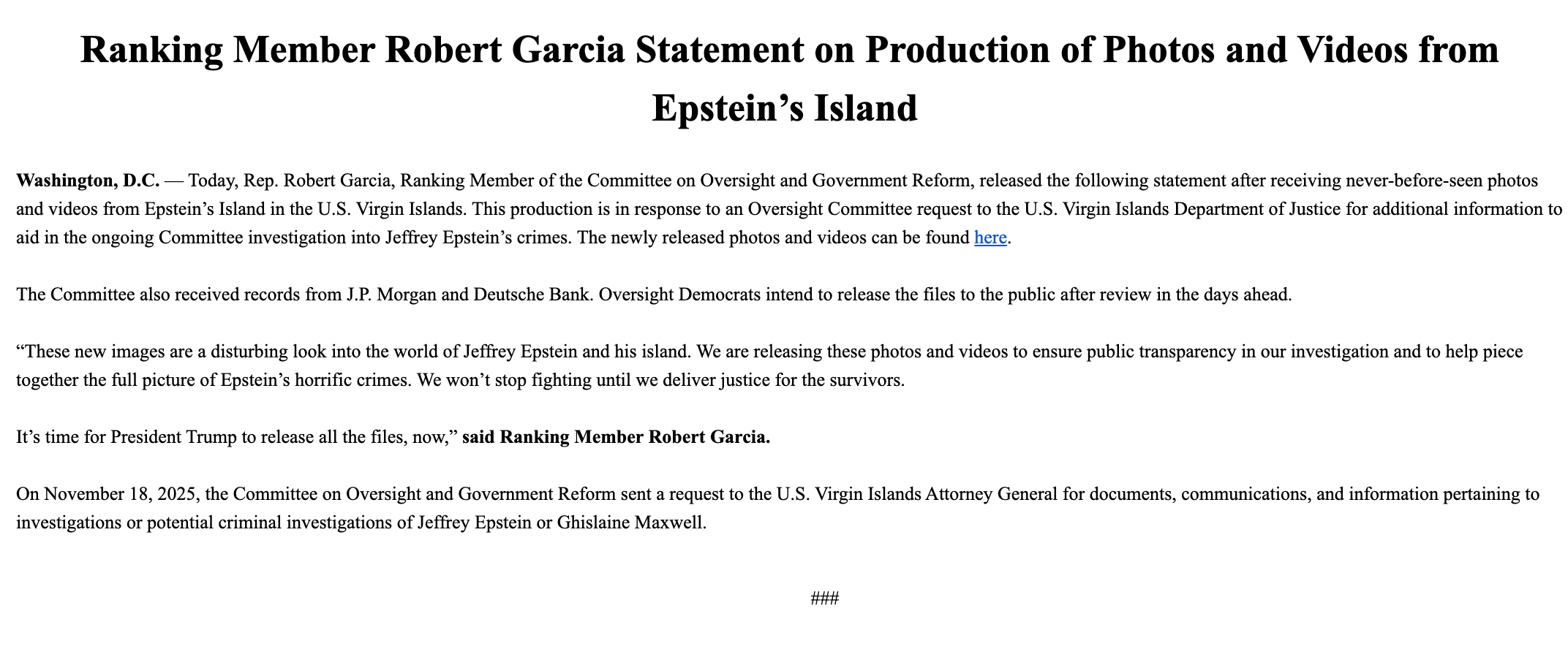 First, the House Oversight Committee has received a new tranche of documents from major financial institutions—JPMorgan Chase and Deutsche Bank—as part of its expanding probe into the late sex offender Jeffrey Epstein and his financial networks. These materials, which include bank records as well as unreleased photos and videos of Epstein’s private compound in the U.S. Virgin Islands, are expected to be made public this week.