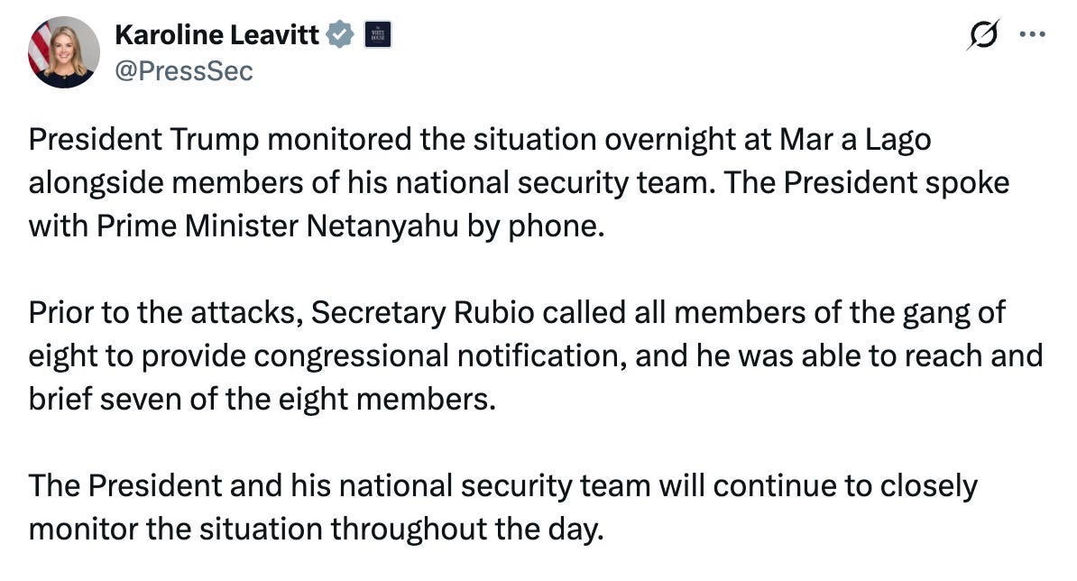 President Donald Trump and Israeli Prime Minister Benjamin Netanyahu spoke following their joint strikes on Iran, with the White House saying Trump monitored the operation overnight from Mar-a-Lago alongside his national security team, will continue tracking developments, and is being continually briefed by Secretary of State Marco Rubio.
