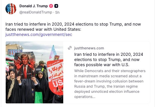Following the strikes in Iran, the American President posted an article suggesting unverified claims that Iran meddled in the American election in 2020 to stop him.
