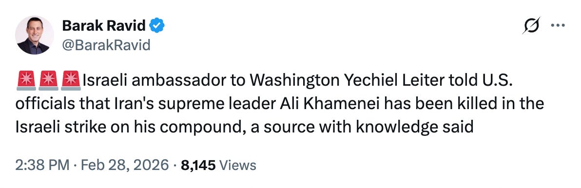 According to reports from Axios, Reuters, and elsewhere, Iran’s Supreme Leader has been killed: