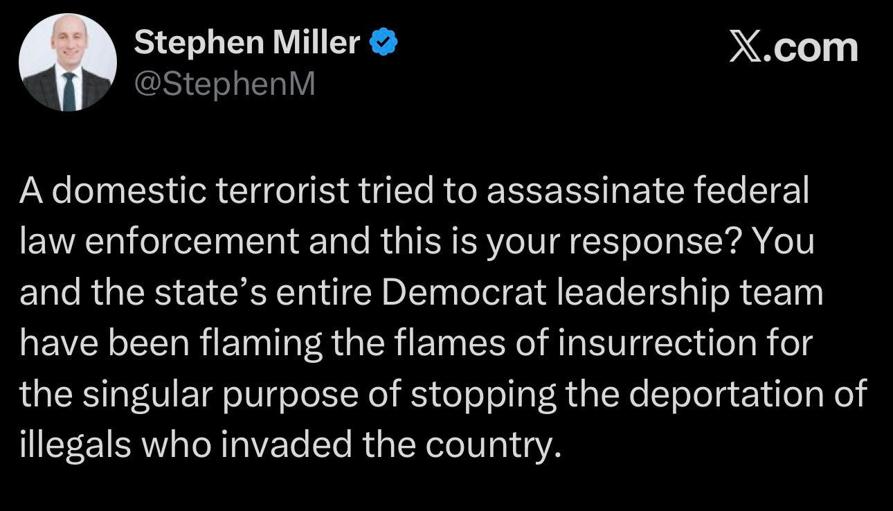 Stephen Miller separately accused the man who was killed of being an assassin.