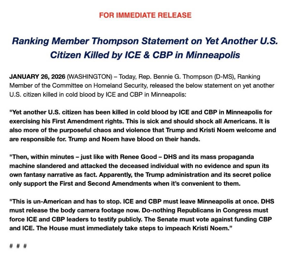 Good evening everyone. As promised, I am bringing you round-the-clock coverage of the news you may have missed today. Tonight’s update once again centers on Minnesota, where deeply disturbing new details have emerged about the horrific shooting we witnessed this morning. At the same time, the political fallout is accelerating. A government shutdown now appears increasingly likely as Democrats reject further ICE funding and even some Republicans are beginning to break with Trump in the wake of this killing.