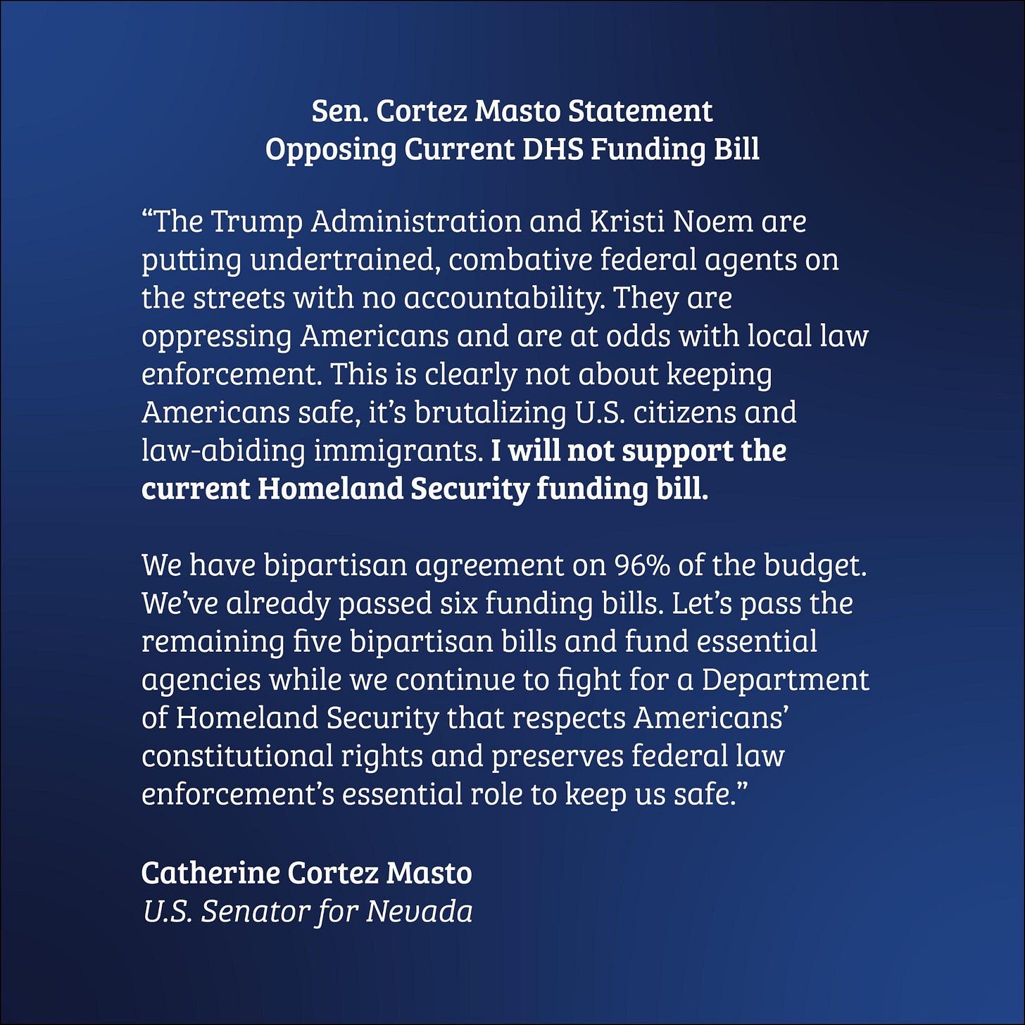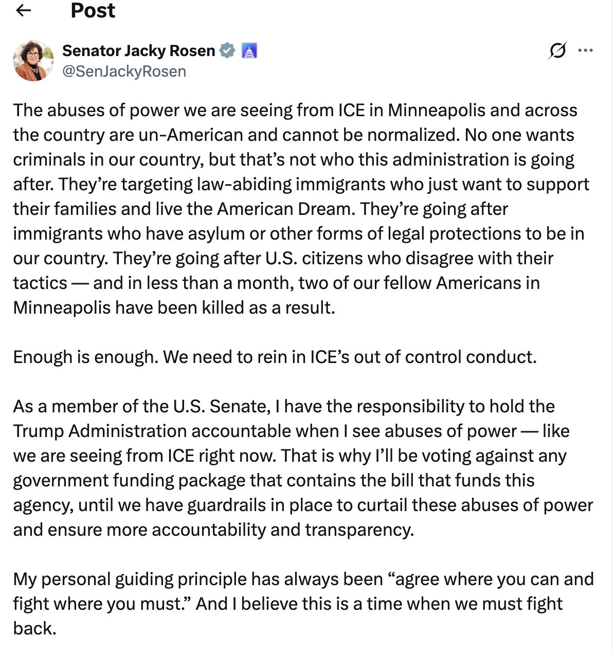 The dam is breaking. Following the horrific Minneapolis shooting, several Democratic Senators have come out against voting for an upcoming appropriations bill that provides additional funding to ICE. Senators, including Catherine Cortez Masto, Jacky Rosen, and Mark Warner, would have likely voted for the bill before today. Now, the Department of Homeland Security is barreling toward a government shutdown because Republicans do not have the votes.