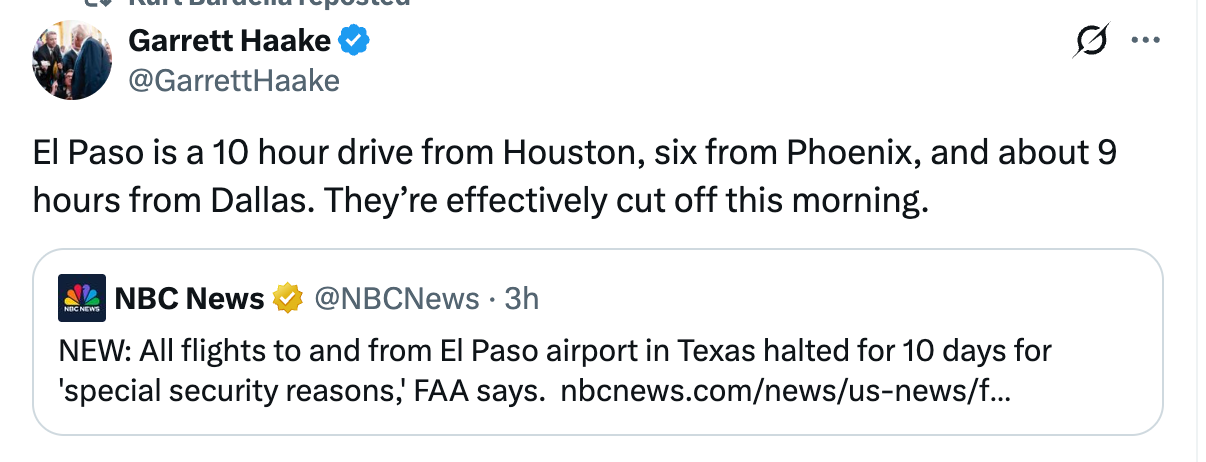 According to El Paso Matters, the FAA abruptly closed airspace over El Paso and parts of southern New Mexico for 10 days, halting all civilian and military flights and citing “national defense airspace” without explanation, a rare move not seen since after 9/11 that has shut down El Paso International Airport and disrupted the region.