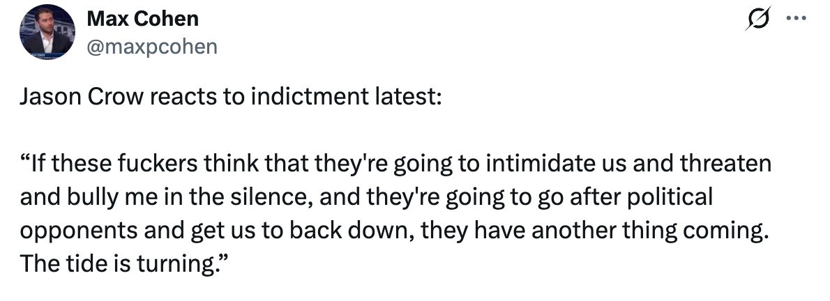 Congressman Jason Crow reacted to the failed indictment attempt: