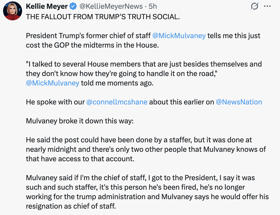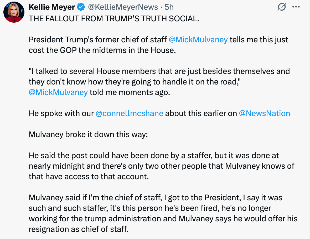 • Trump’s former Chief of Staff, Mick Mulvaney, suggested that the Truth Social post ended any hopes that Republicans had to win in the midterm elections: