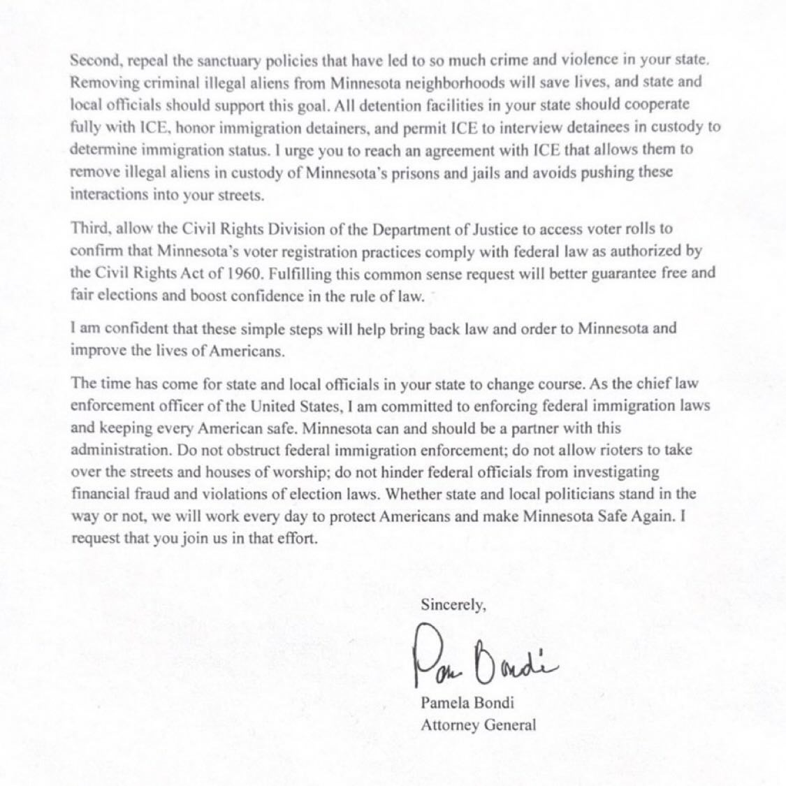 “Allow the Civil Rights Division of the Department of Justice to access voter rolls to confirm that Minnesota’s voter registration practices comply with federal law as authorized by the Civil Rights Act of 1960,” Bondi wrote.