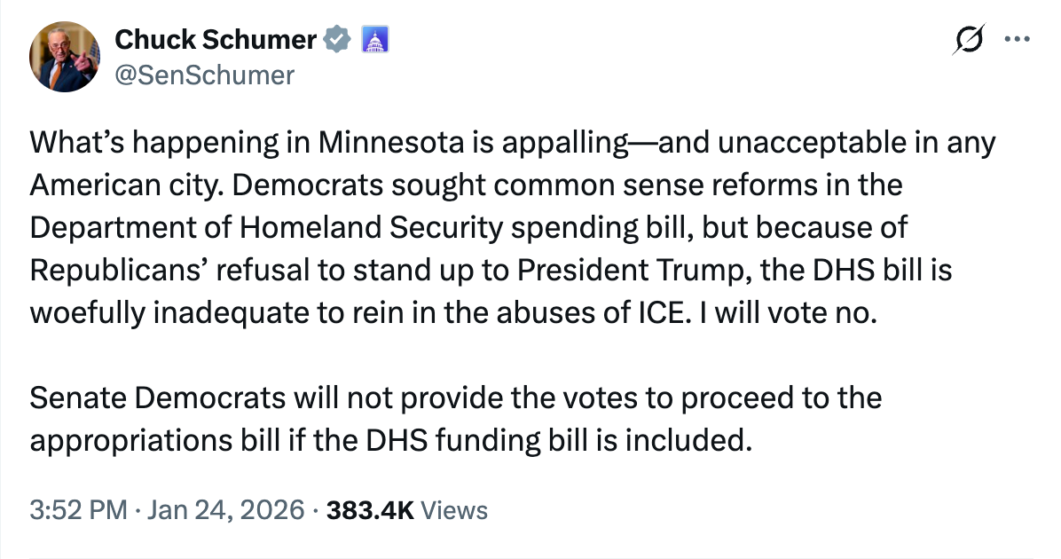 “What’s happening in Minnesota is appalling—and unacceptable in any American city,” Schumer said. “Democrats sought common sense reforms in the Department of Homeland Security spending bill, but because of Republicans’ refusal to stand up to President Trump, the DHS bill is woefully inadequate to rein in the abuses of ICE. I will vote no.”