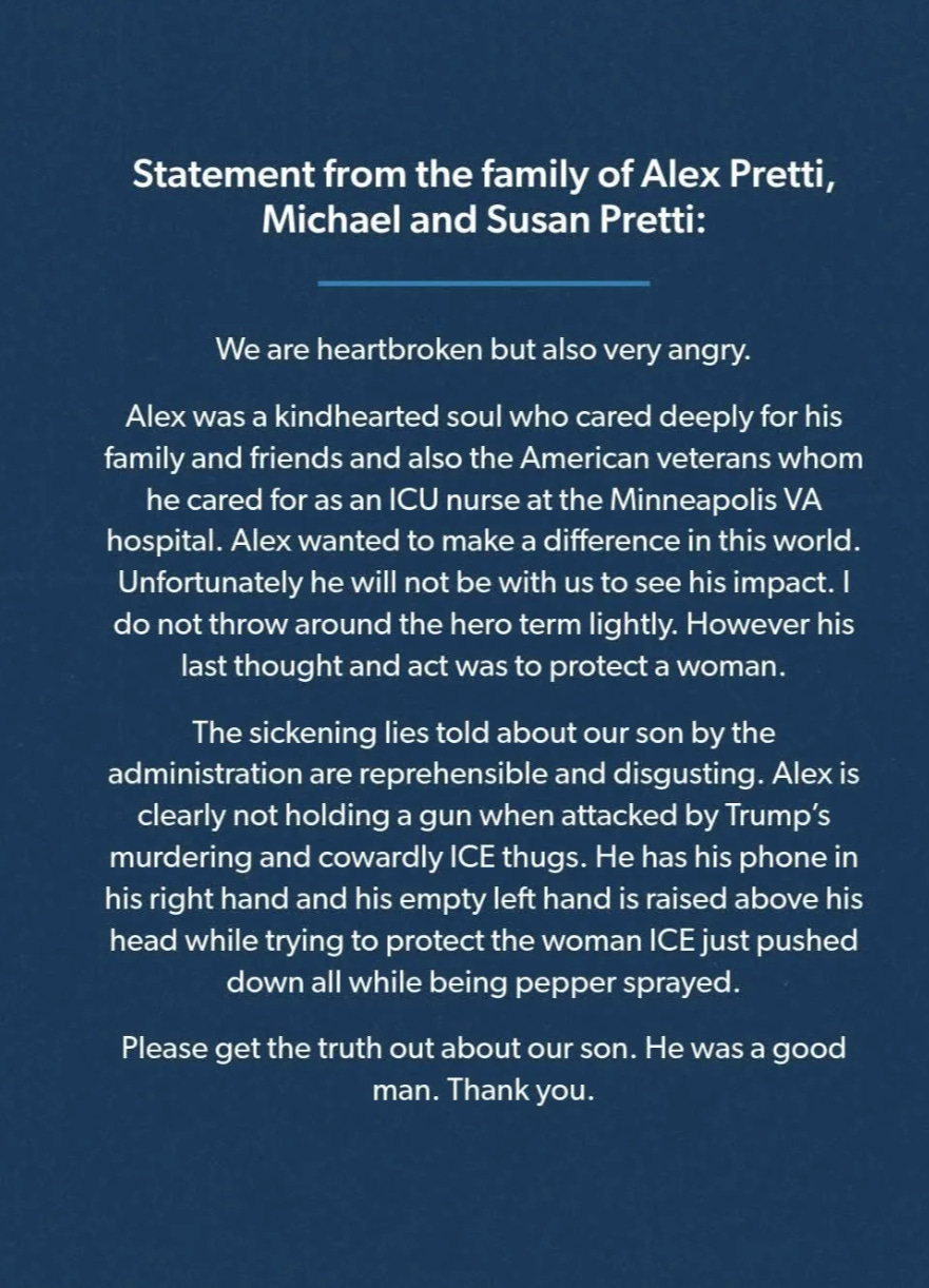 “The sickening lies told about our son by the administration are reprehensible and disgusting,” the family said in a statement released Saturday night. “Alex is clearly not holding a gun when attacked by Trump’s murdering and cowardly ICE thugs.”