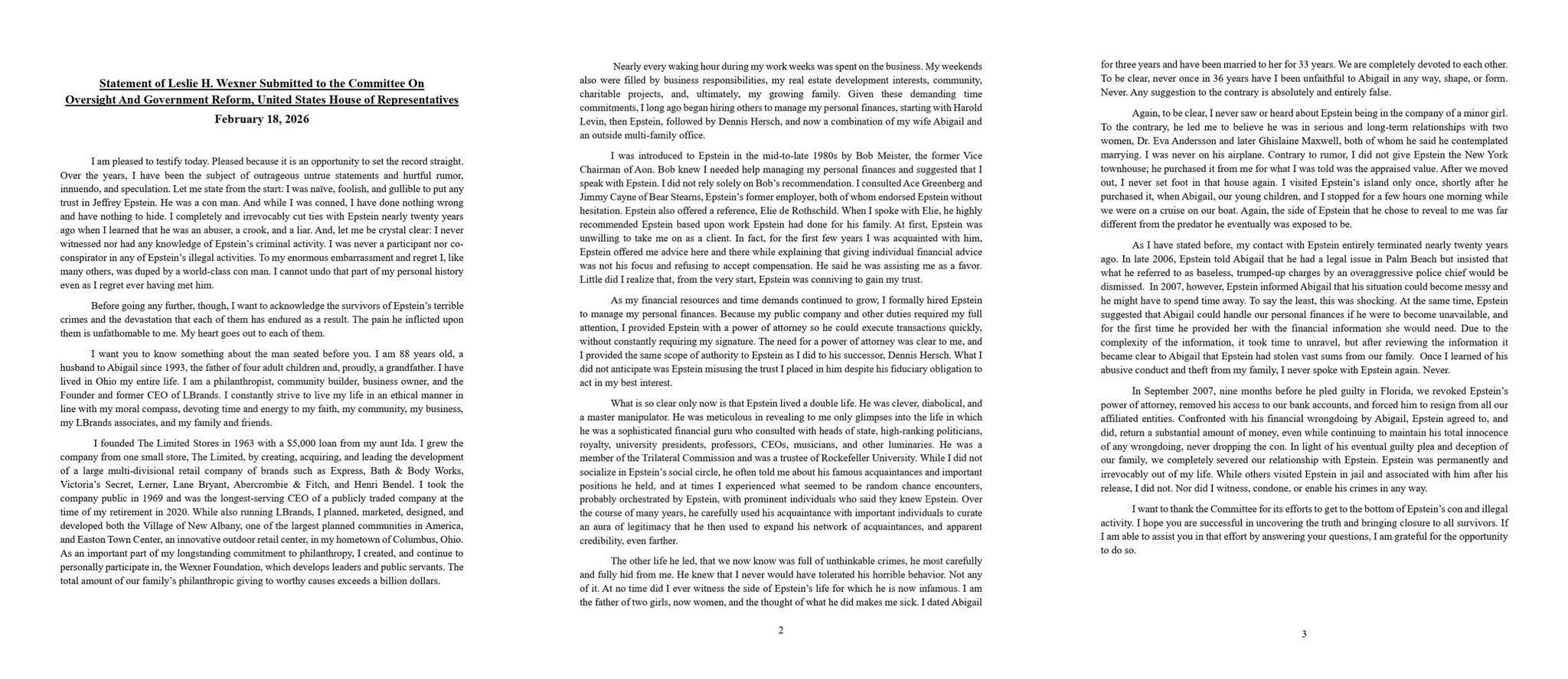 Billionaire Les Wexner told House lawmakers he was “conned” by Jeffrey Epstein, denied any knowledge of or involvement in Epstein’s crimes, said he cut ties in 2007 after discovering alleged abuse and financial theft, and maintained he has never been charged with wrongdoing. This is his statement (zoom in):