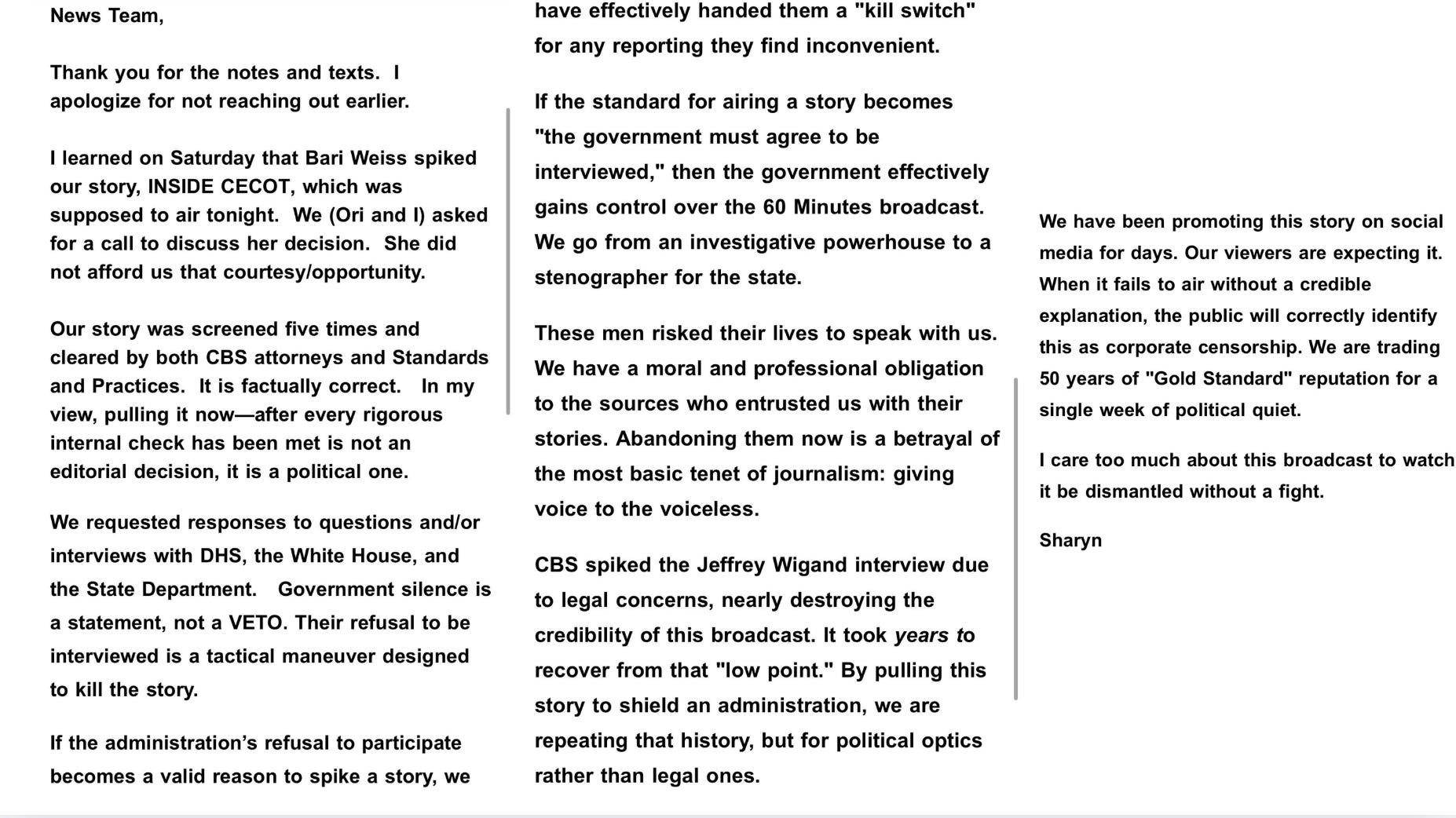 Sharyn Alfonsi told fellow correspondents that she learned at the last minute that CBS News editor in chief Bari Weiss had pulled a planned 60 Minutes segment on a maximum-security prison in El Salvador where the Trump administration sent Venezuelan deportees. In a Sunday email to colleagues including Lesley Stahl, Scott Pelley and Anderson Cooper, Alfonsi said the story was “spiked” and argued the move was political rather than an editorial judgment. Read her email here:
