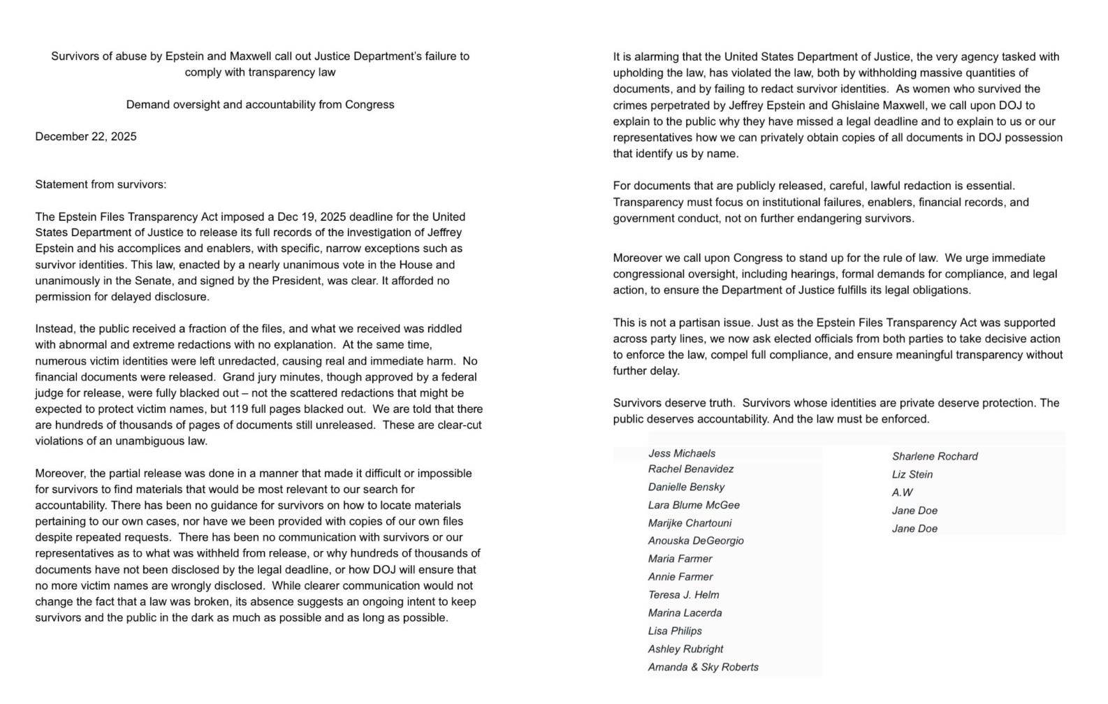This morning, I have obtained a new statement from more than one dozen Epstein survivors blasting the Department of Justice for failing to redact the information of survivors and failing to communicate with survivors. The statement calls for immediate Congressional action to ensure that survivors are protected and to force the Department of Justice to follow the law when releasing the files. This is the most forceful statement from survivors to date.