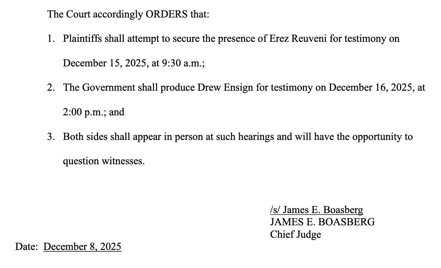 Judge Boasberg ordered former DOJ whistleblower Erez Reuveni to testify on Dec. 15 in revived contempt proceedings over the March 15 migrant flights, with Drew Ensign required to testify the following day.