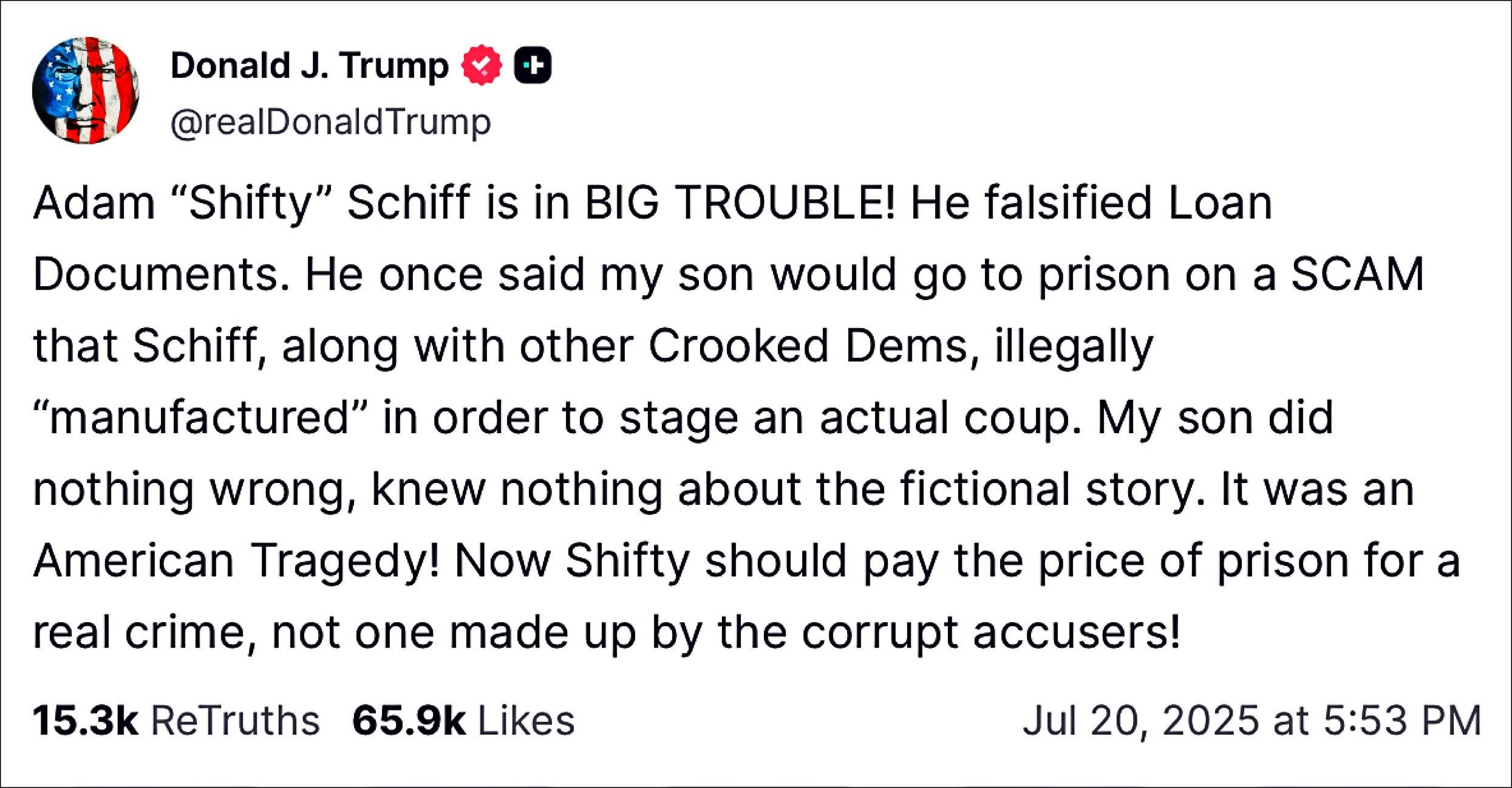 Donald Trump suggested that Senator Adam Schiff should “pay [a] price,” attacking another political opponent:
