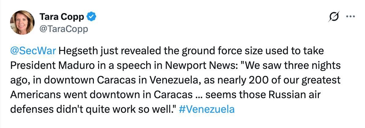 Pete Hegseth said nearly 200 U.S. troops were deployed in downtown Caracas to seize Nicolás Maduro, claiming in a speech that Russian air defenses failed to stop the operation.