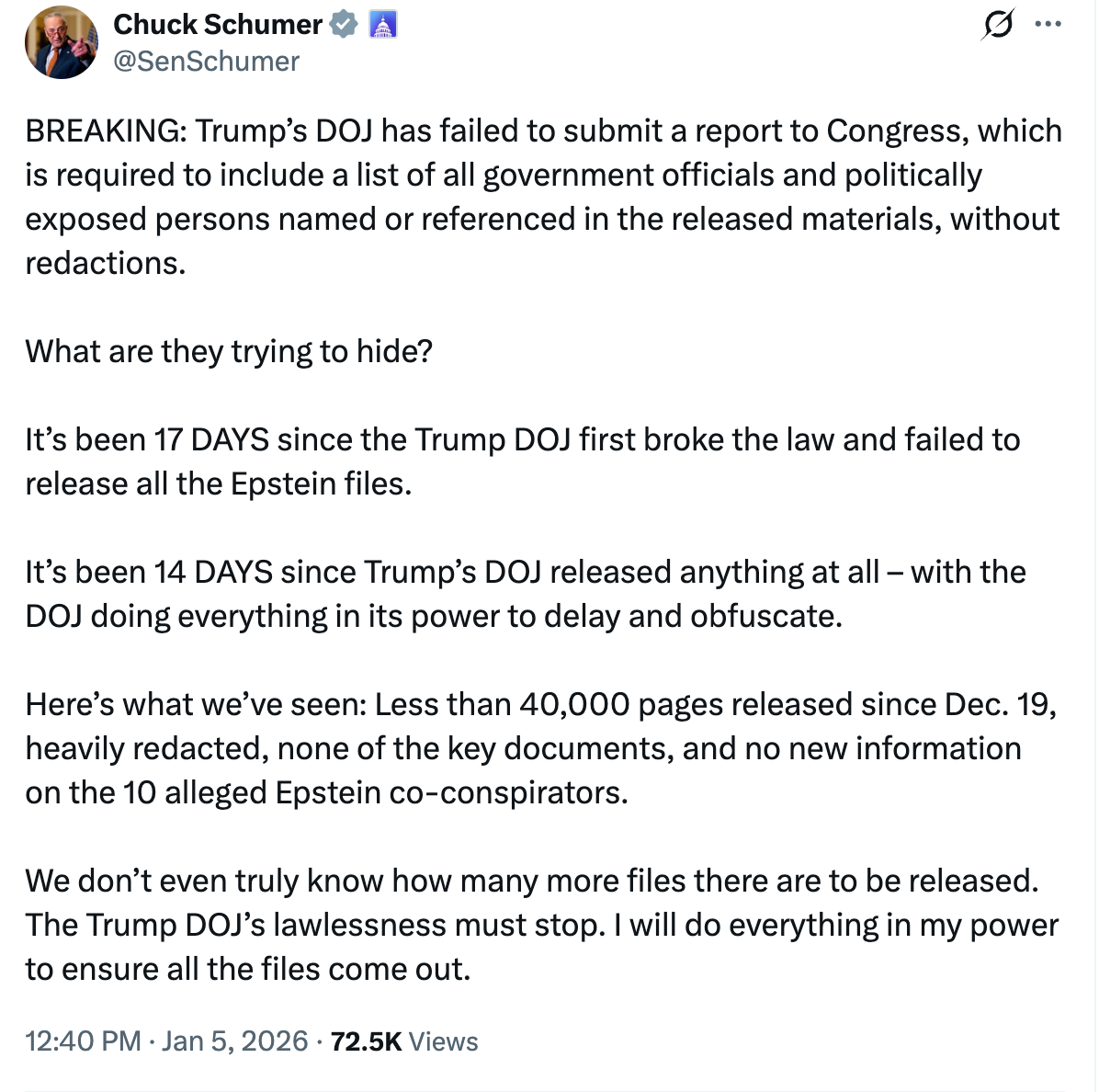 Chuck Schumer sharply criticized the U.S. Department of Justice for failing to provide Congress with an unredacted report naming politically exposed individuals referenced in the Jeffrey Epstein files, accusing the Trump administration of unlawfully delaying and obscuring disclosures required under the Epstein Files Transparency Act.