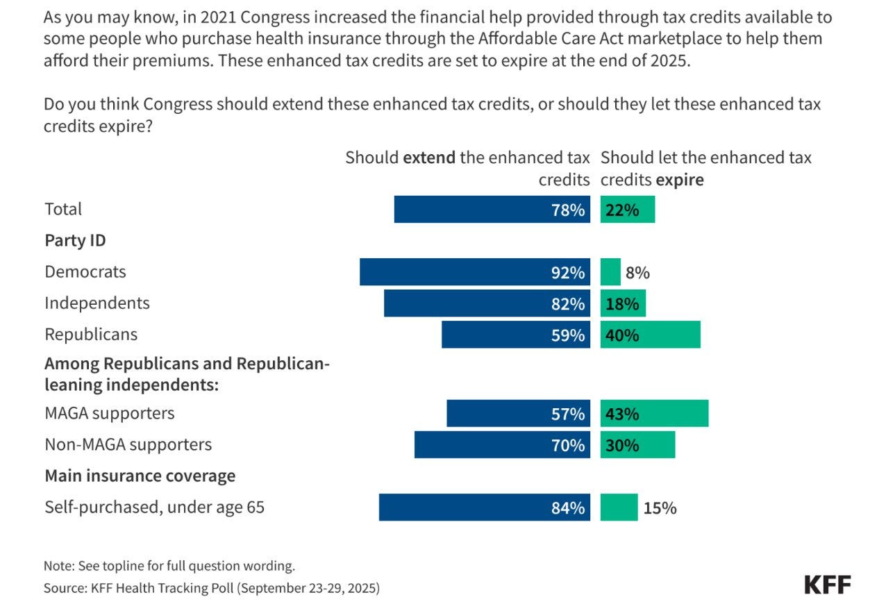 Those in President Trump’s own party are beginning to slightly turn against his position in the government shutdown. This morning, a KFF poll found over three-quarters of Americans want Congress to extend enhanced ACA subsidies, including 92% of Democrats, 82% of independents, 59% of Republicans, and 57% of MAGA supporters; the subsidies, set to expire at year’s end, drew 24 million enrollees in 2025 and if they lapse, premiums could more than double in 2026, with 2 in 5 saying they’d drop coverage—39% would blame Trump, 37% Republicans in Congress, and 22% Democrats.