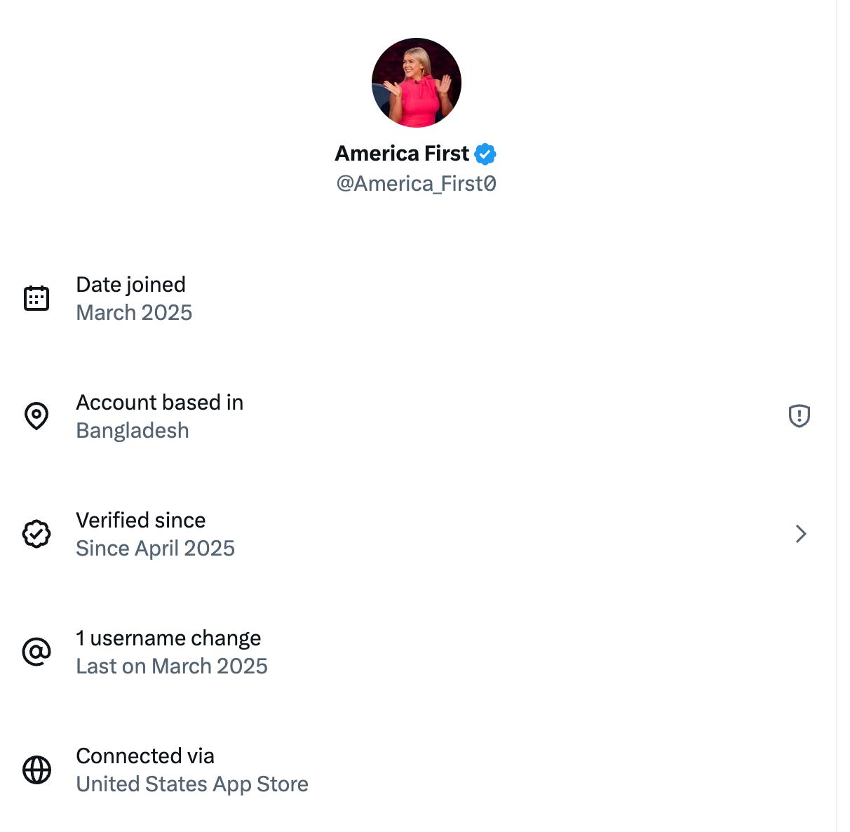 America_First0 — This account has hundreds of thousands of followers yet is based in Bangladesh.