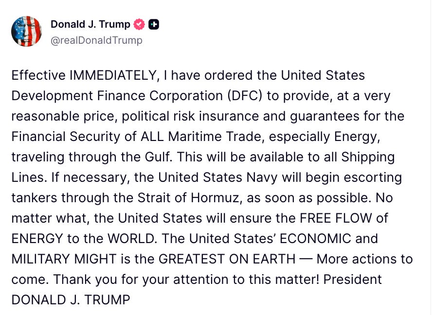 Donald Trump announced that he will be having the United States Navy escort oil tankers through the Strait of Hormuz: