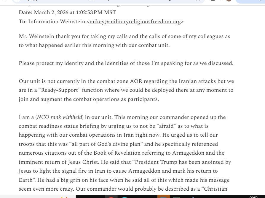 According to the Huffington Post and the New Republic, U.S. military commanders are reportedly telling troops the Iran war is “all part of God’s divine plan,” with one noncommissioned officer alleging a commander said “President Trump has been anointed by Jesus to light the signal fire in Iran to cause Armageddon and mark his return to Earth,” comments the officer said “destroy morale and unit cohesion” and violate constitutional oaths.
