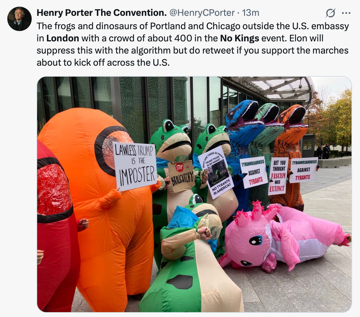 No Kings Day has begun this morning in London, as one poster noted a crowd of about 400 people protested outside of the United States embassy in London. Protests are expected in Ireland as well.