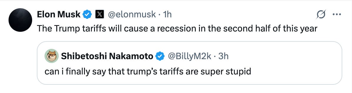 Musk further tweeted that Trump’s tariffs would cause a recession this year.