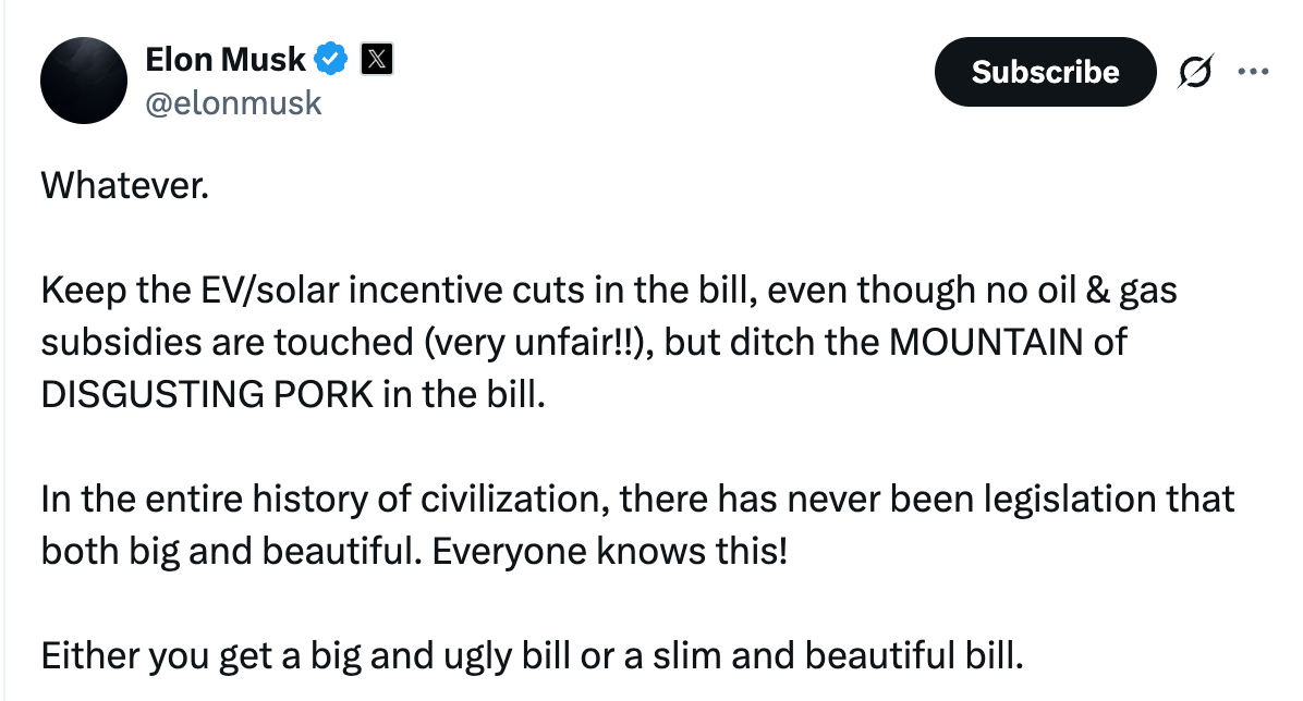 He went on to suggest that Musk’s discontent stemmed from recent legislation — particularly a bill backed by the White House that includes significant cuts to the electric vehicle tax credit. That policy change directly affects Musk’s business interests.
