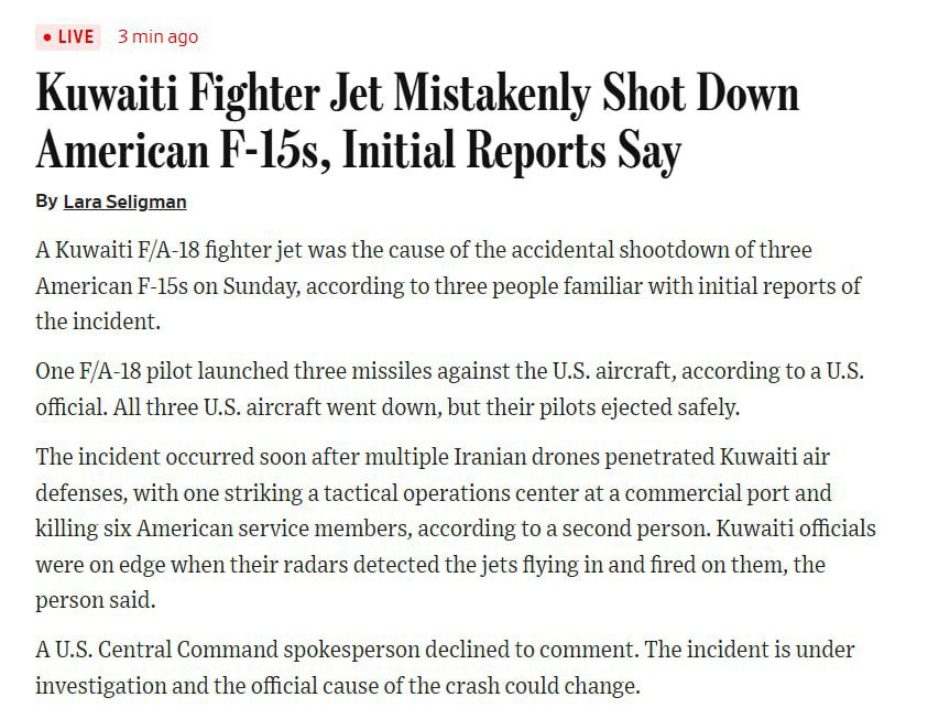 A Kuwaiti F/A-18 fighter jet mistakenly shot down three U.S. F-15 aircraft on Sunday in a friendly-fire incident, according to the Wall Street Journal: