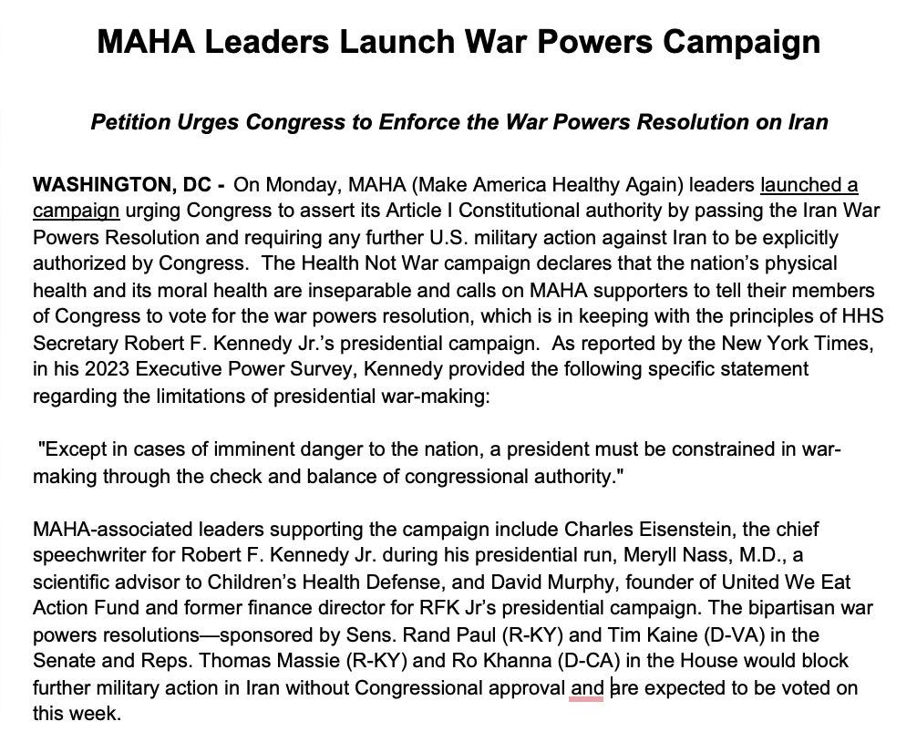 The MAHA movement has broken with President Trump over the Iran conflict and is now lobbying Congress to pass a War Powers Resolution to limit U.S. military action without congressional approval.