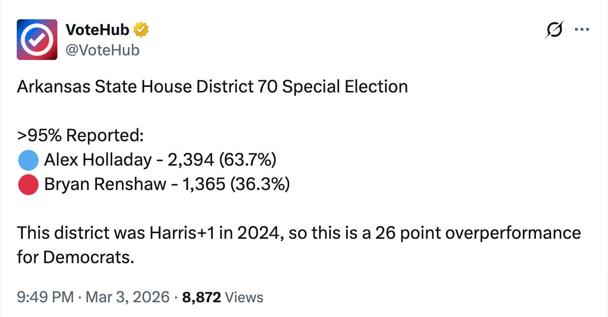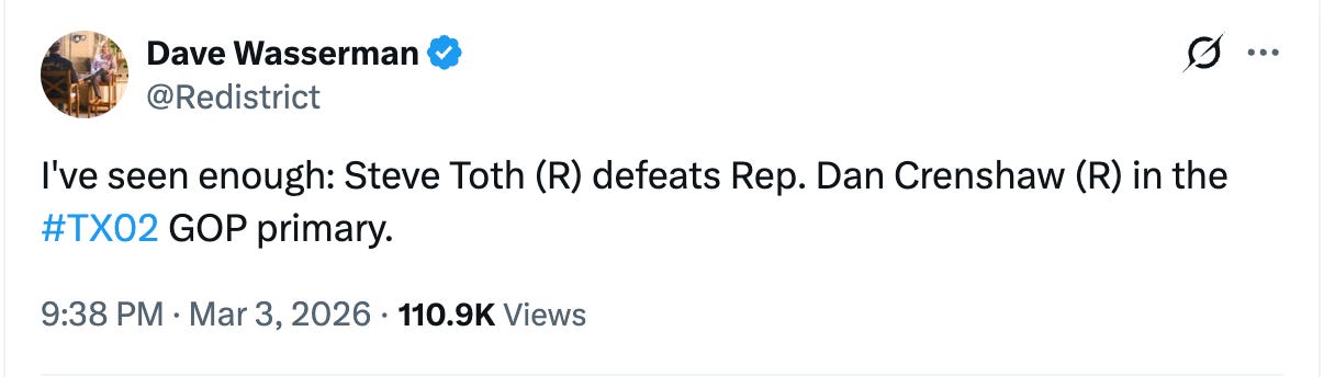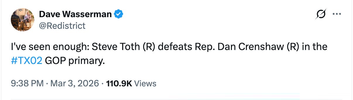 Good evening everyone. I promised one final update tonight and there is a lot to cover. We now have results from critical primary elections in North Carolina, and soon, in Texas (I will update this article once we have more information). At the same time, major developments are unfolding around the Iran conflict. Senators leaving classified briefings say they are increasingly worried about the possibility of American boots on the ground. Reports also indicate the CIA is arming Iranian opposition forces in an effort to spark an uprising.