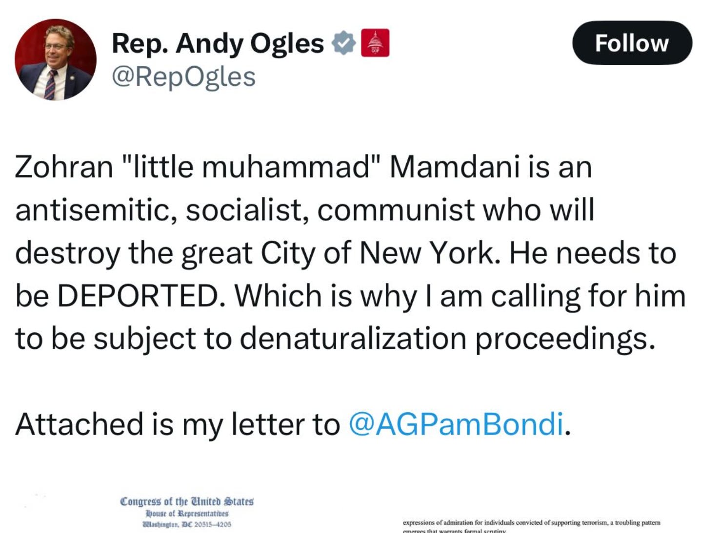 A Republican Congressman is calling for Zohran Mamdani to be deported in one of the worst Islamophobic posts I’ve seen.