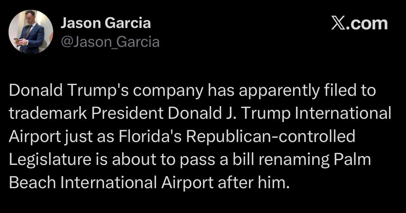 Donald Trump’s private company filed trademark applications on February 13 and 14 for “President Donald J. Trump International Airport,” “Donald J. Trump International Airport,” and “DJT,” seeking to reserve the names for airport-related services.