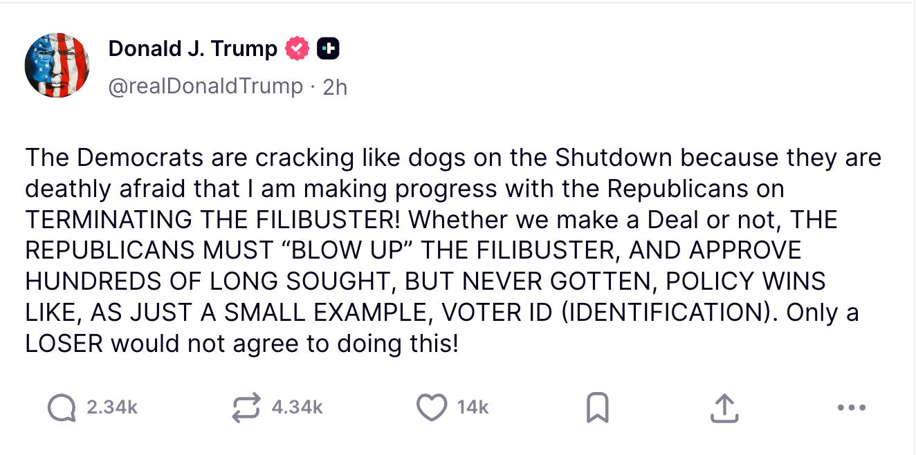 As the shutdown drags into day 39, Trump doubles down on his unrealistic push to end the Senate filibuster as leverage, despite Republican resistance, recent GOP election losses and stalled negotiations, while Democrats and the White House trade accusations and fail to agree on a path to reopen the government.