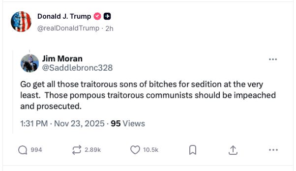 Donald Trump spent the afternoon on Truth Social posting about imprisoning and arresting Democratic lawmakers, including posting an AI generated meme of himself as king, sitting on a throne, with three Democratic Senators kneeling at his feet.