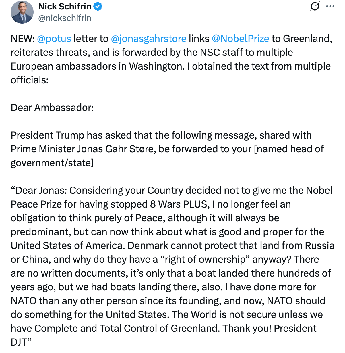 Overnight we learned that Donald Trump sent an ominous letter to Norway suggesting war could be on the table over Greenland as he is upset that Norway did not award him the Nobel Prize.