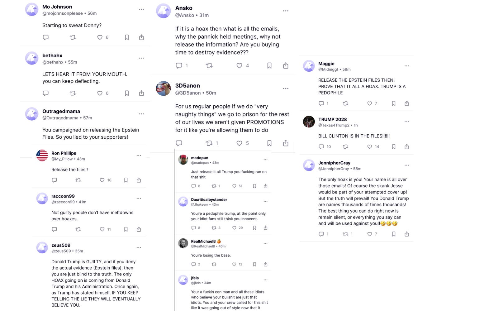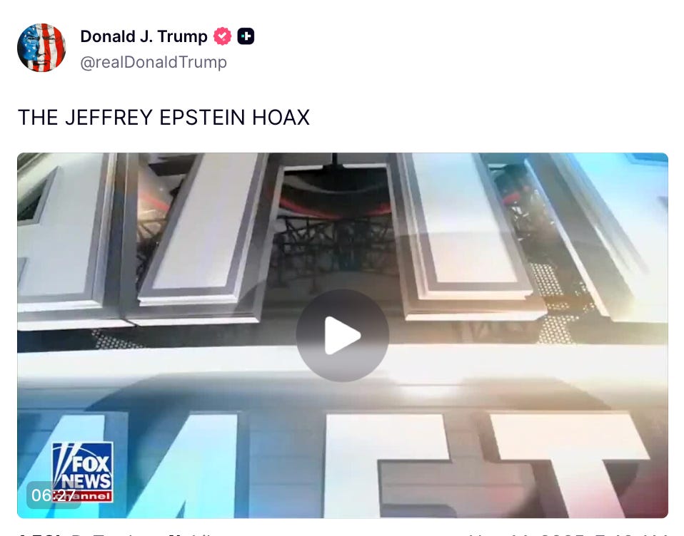Good morning everyone. Donald Trump has finally broken his 36-hour silence, dismissing the Epstein files as a “hoax,” and his supporters are erupting in anger, turning on him online and demanding the full release of the records. At the same time, Ghislaine Maxwell is reportedly receiving even more preferential treatment in prison, including unlimited toilet paper, and Speaker Mike Johnson is now moving to fast track a vote on releasing the Epstein files as early as mid-week next week.
