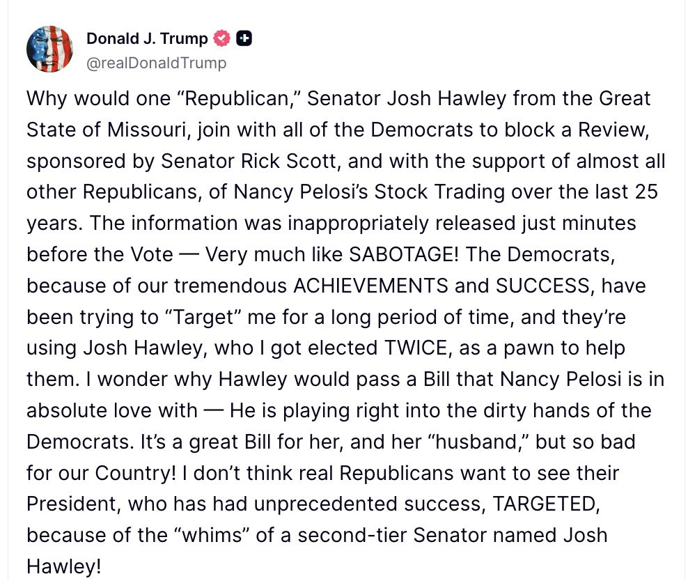 Trump calls Missouri Senator Josh Hawley a second-tier senator over stock trading ban spat.