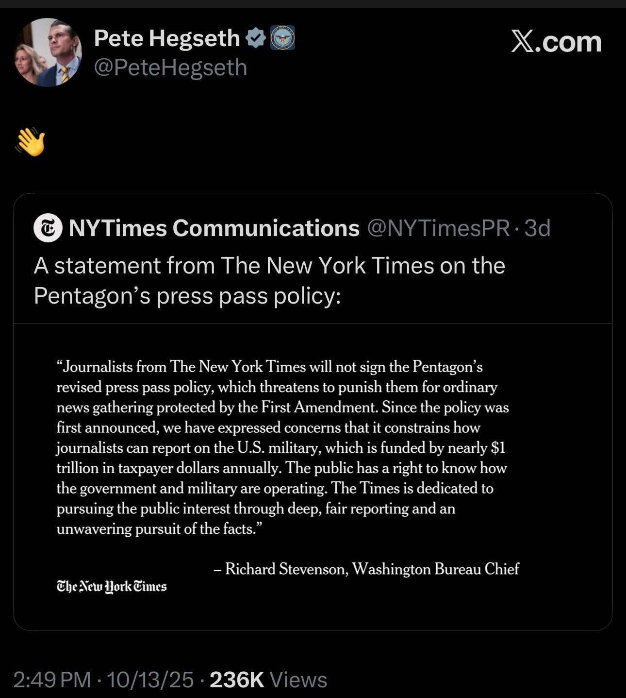 Secretary of Defense Pete Hegseth has signaled that major media outlets will not be allowed to cover the Pentagon after many, including the New York Times, Washington Post, CNN, and The Guardian have refused to sign onto Hegseth’s pledge for the press.