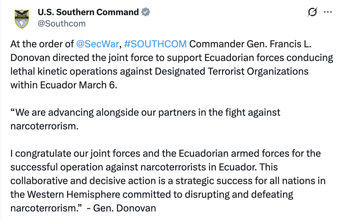 Overnight, the U.S. military carried out a targeted strike in Ecuador alongside Ecuadorian forces against a narco-terrorist supply complex, part of a broader campaign to dismantle drug trafficking networks in the region. U.S. Southern Command said the operation involved lethal action against designated terrorist organizations at Ecuador’s request, while Defense Secretary Pete Hegseth confirmed the strike and said more operations were likely as the U.S. expands efforts with regional partners to disrupt narco-terrorism across the Western Hemisphere.